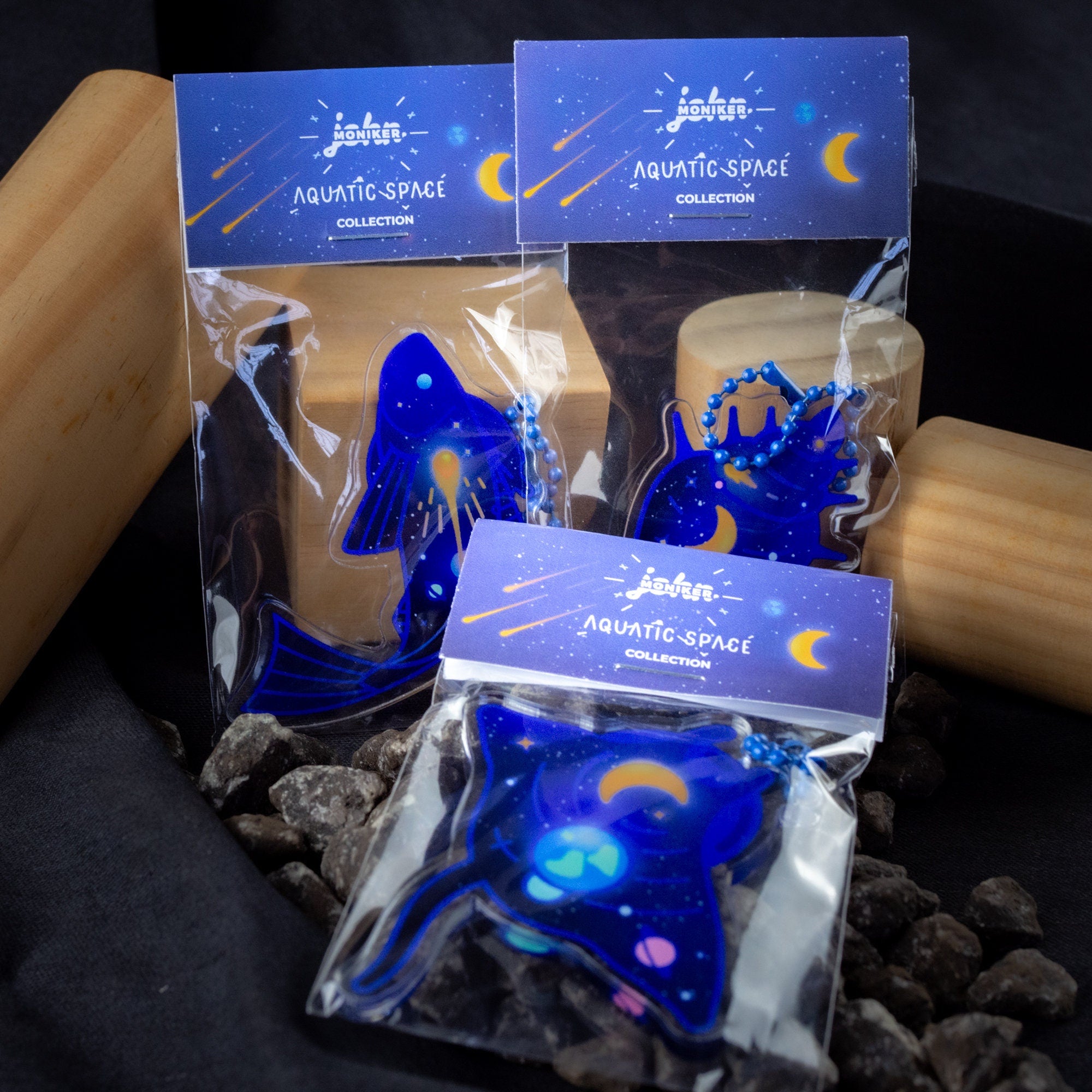 • Durable acrylic double sided print keychain • Each keychain comes with blue ball bead chain • Sizing: Space Ray is 6.2cm(H) x 6.3cm(W), Space Trout is 6.8cm(H) x 4.9cm(W), Space Conch is 7cm(H) x 4cm(W)
