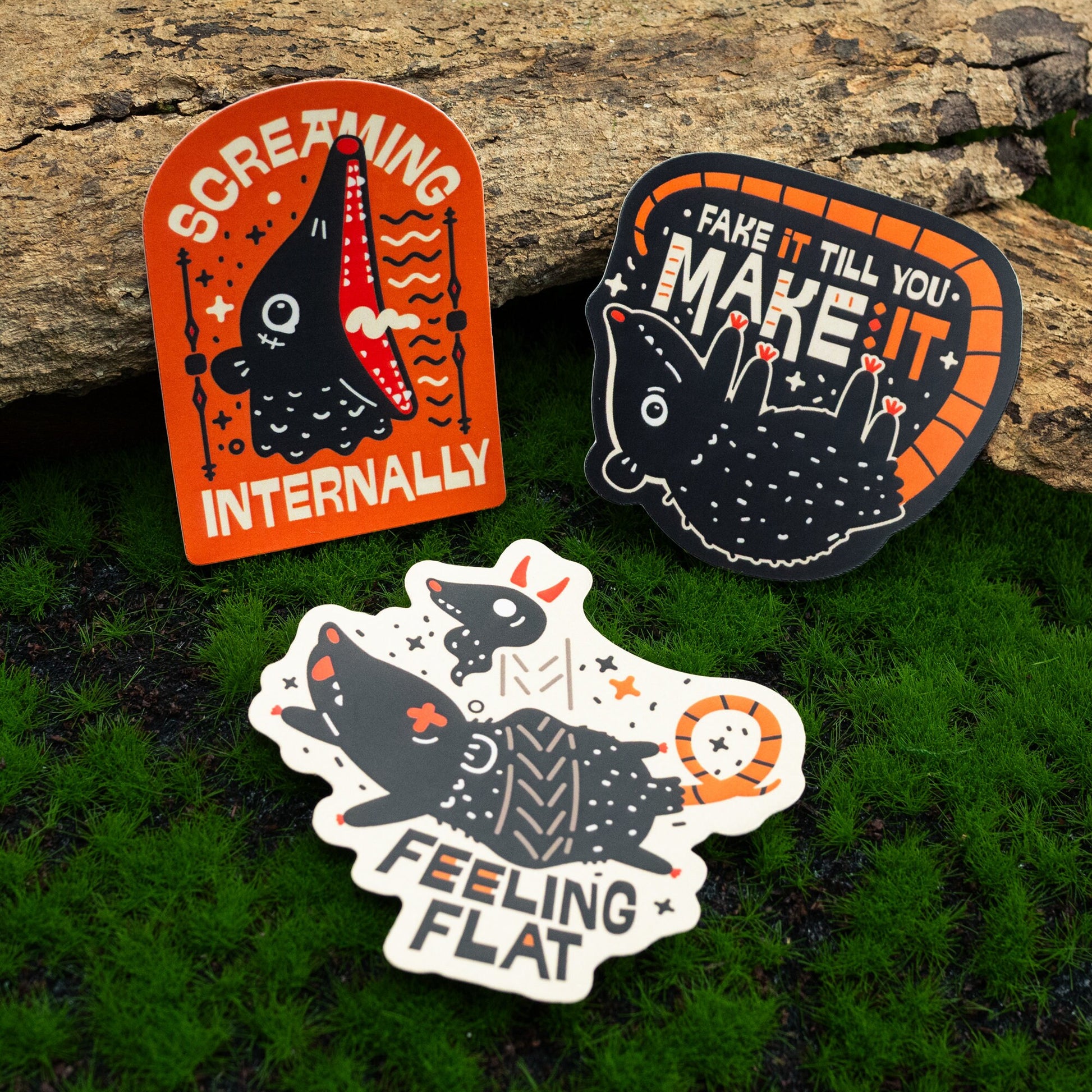 Screaming internally? We gotcha! Consisting of 3 individual vinyl die-cut stickers featuring our OC Imp Possum, this sticker pack captures visceral visual goodness to express your inner anxiety. Check out the rest of the series!