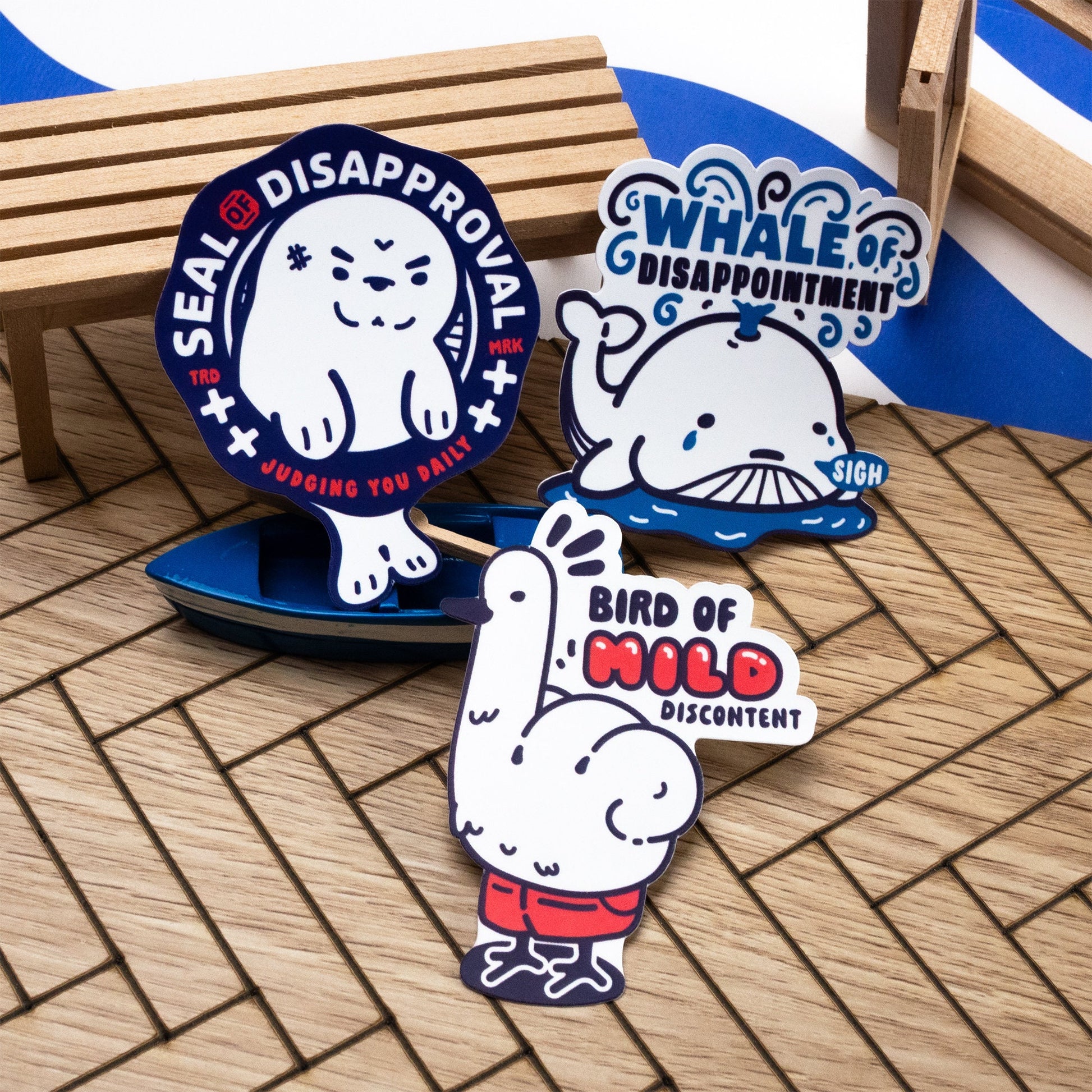 • Made for pool conditions, each vinyl sticker is waterproof with a matt finish • For best results, please clean the surface and ensure it is oil-free before pasting! • Bird of Mild Discontent Sticker is sized 4.9cm(W) x 6.5cm(H) • Seal of Disapproval Sticker is sized 5.1cm(W) x 6.3cm(H) • Whale of Disappointment Sticker is sized 5.4cm(W) x 5.5cm(H)